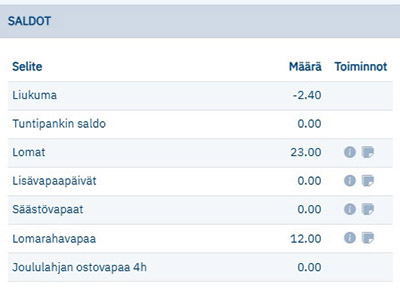 Liukumasaldot, työaikapankki, pekkaset, lomat ja lomalauantait päivitettynä.