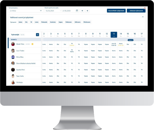 Helppokäyttöistä työvuorosuunnittelua, johon on mm. integroitu automaattiset TES-tulkinnat lisien laskentaan.