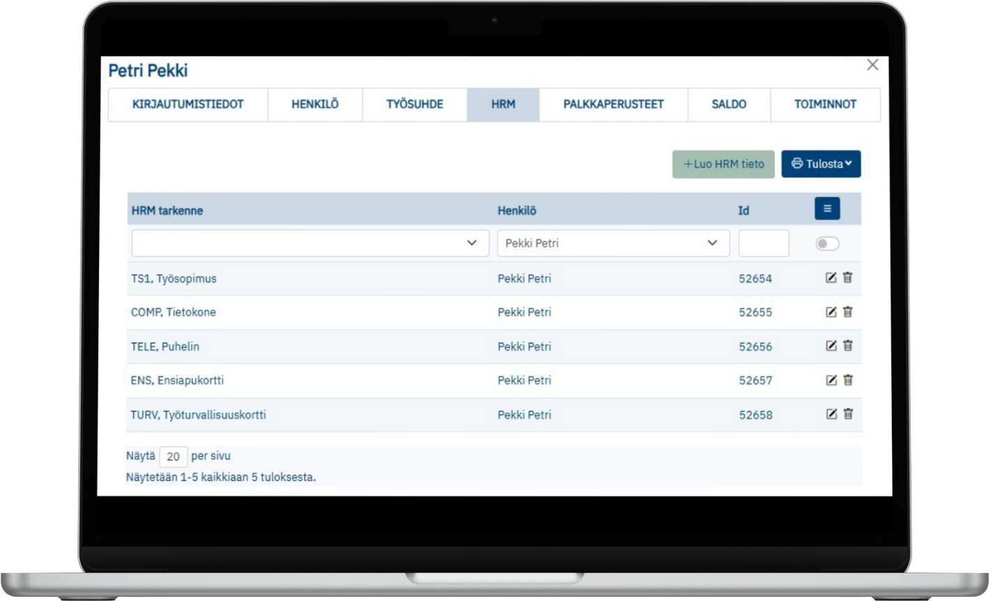 - henkilöroolien hallinta (viisi roolia)