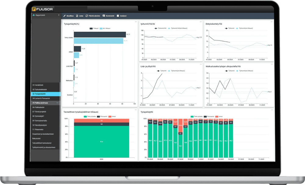 HR raportointi nyt koottuna Fuusorin helppokäyttöiseen ja visuaaliseen kokonaisuuteen. Tiedot saadaan yhdistettyä HR-järjestelmästä, työajanseurannasta, palkoista ja työvuorosuunnittelusta. Palkka-avoimuus direktiivin mukainen raportointi valmiina.